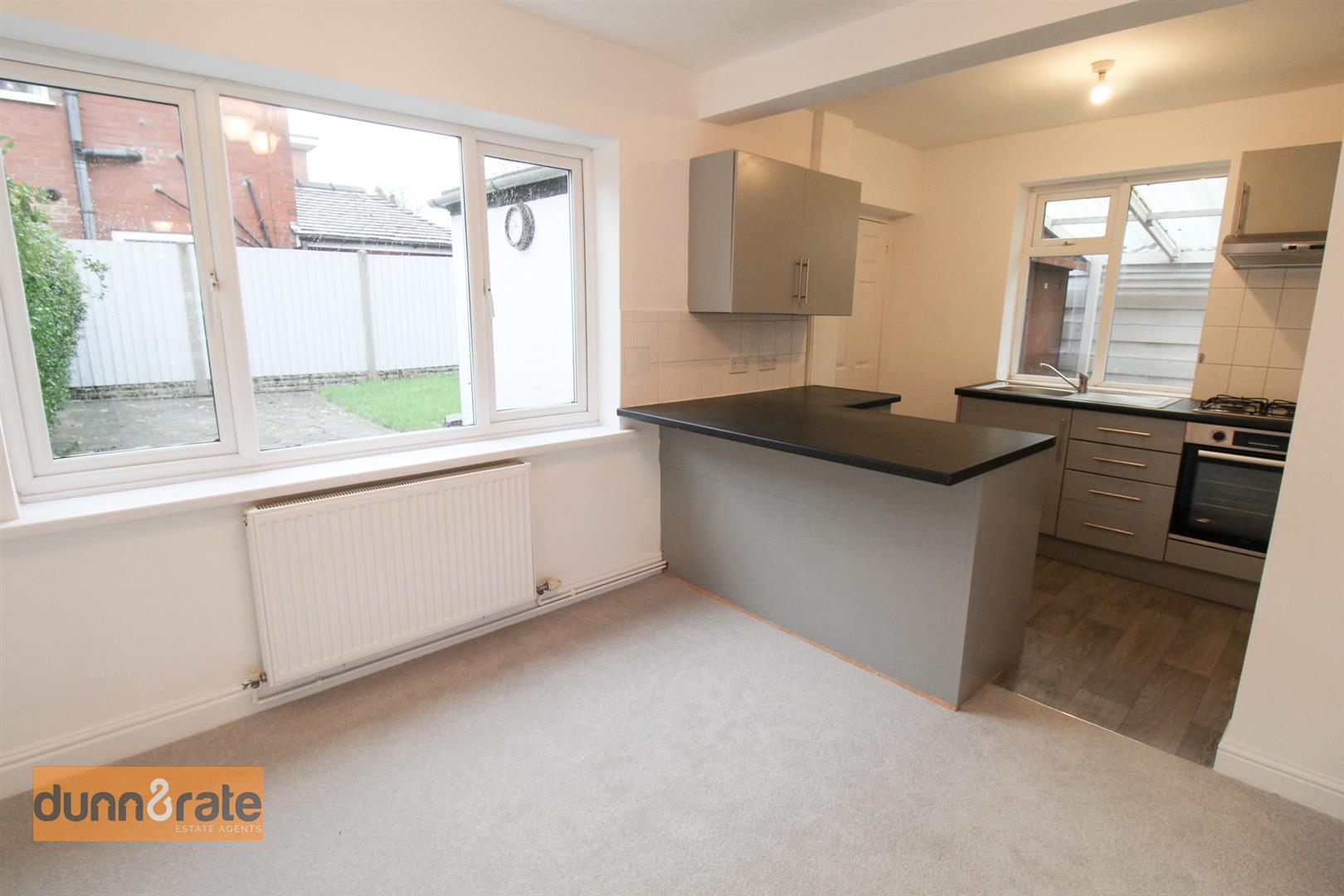 A double glazed window overlooks the side and rear aspect. Fitted with a range of wall and base storage units with inset stainless steel sink unit and side drainer. Coordinating work surface areas and partly tiled walls. Integrated electric oven with gas hob and cooker hood above. Space for fridge/freezer. Radiator. Space for table and chairs.
