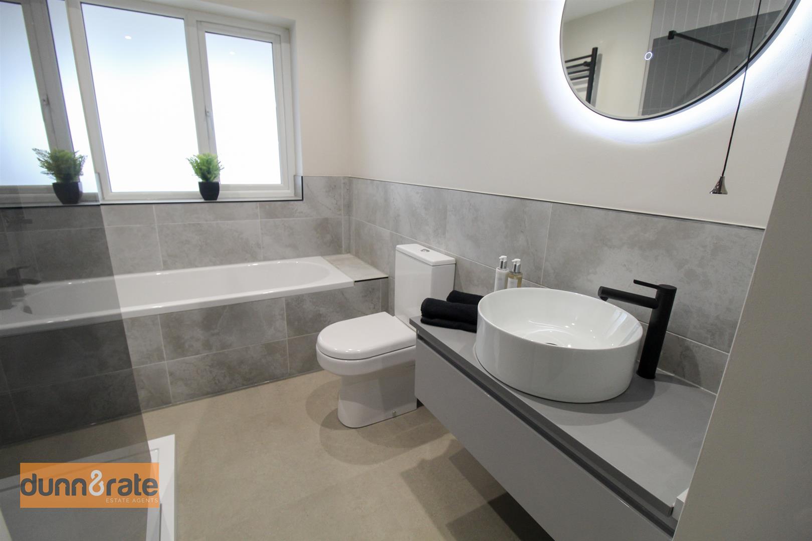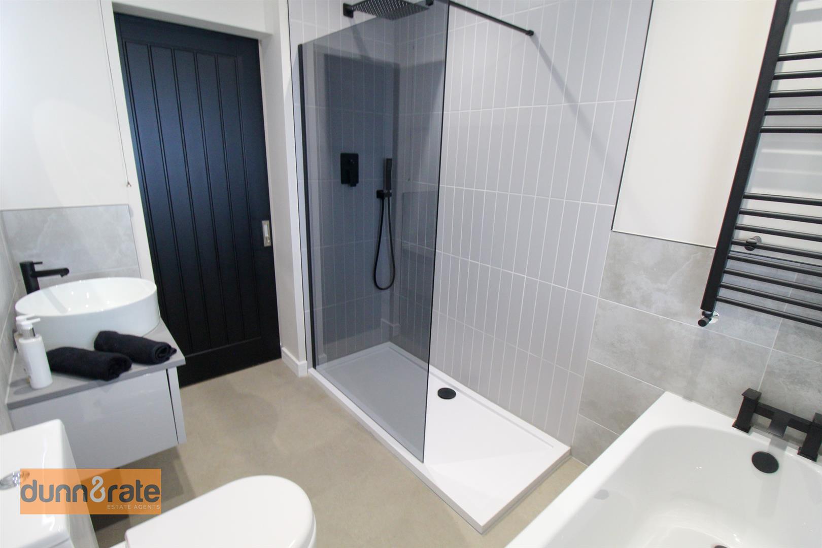 A double glazed window overlooks the side aspect. Fitted with a suite comprising bath, walk in shower unit and waterfall shower head, vanity bowl wash basin and low level W.C. Partly tiled walls and ceiling spotlights. Extractor fan and ladder style towel radiator.